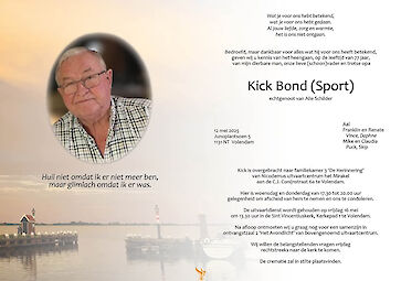 Dinsdagochtend heeft ons het droevige nieuws bereikt dat Kick Bond (Sport) is overleden.