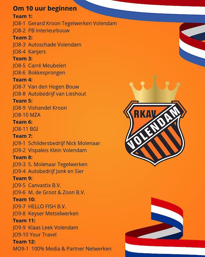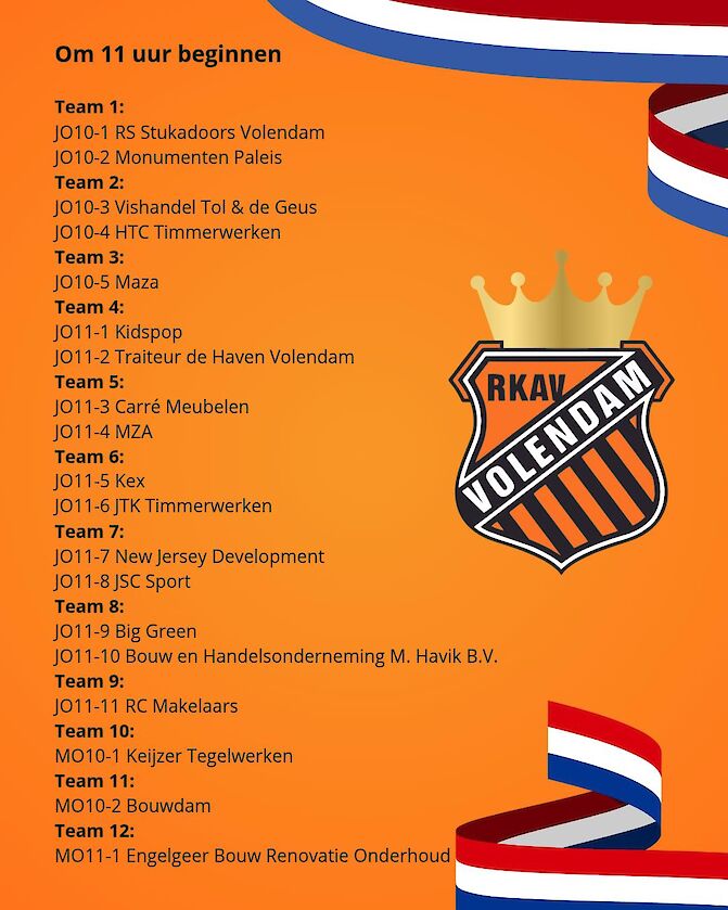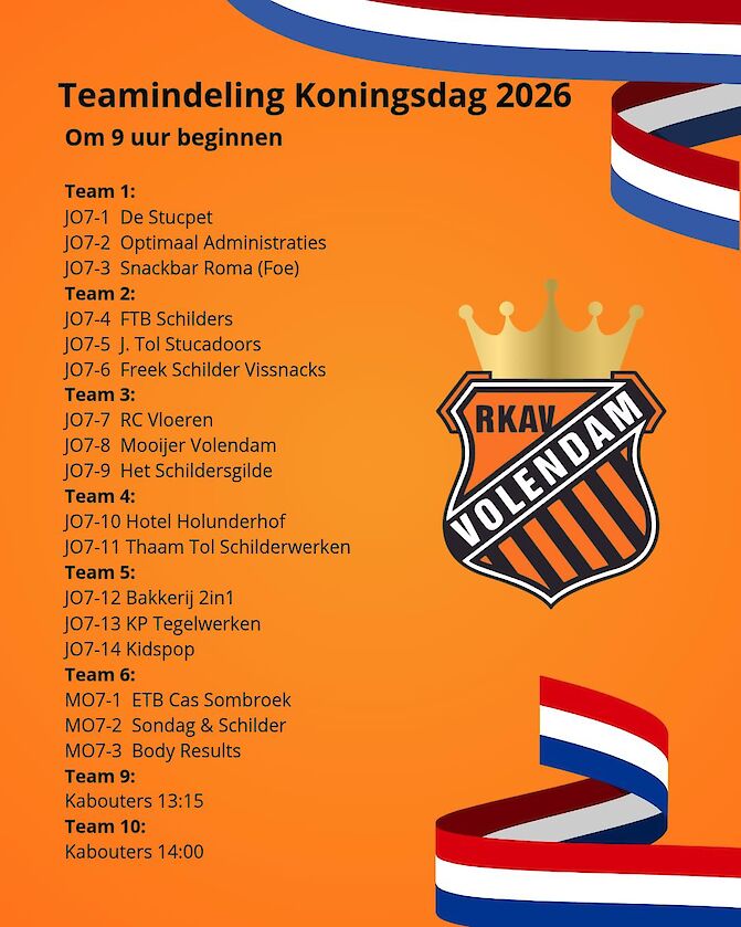 Op maandag 27 april staat het terrein van RKAV Volendam weer volledig in het teken van Koningsdag. Traditiegetrouw organiseren wij een feestelijke en sportieve dag voor onze jeugdspelers, waarbij plezier en samen voetbal beleven centraal staan.