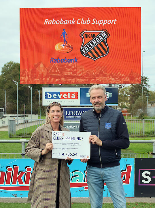 Donderdagmiddag heeft Directeur Karin Kuin van de Rabobank Waterland en Omstreken namens de Rabobank aan voorzitter Vincent Gruwel v.d. RKAV Volendam een heel mooi bedrag overhandigd t.w.v. €4.736,54 in het kader van Rabo ClubSupport 2025.